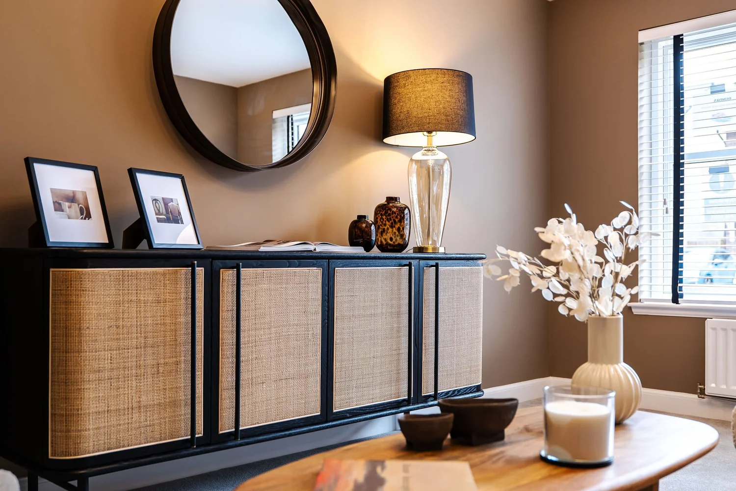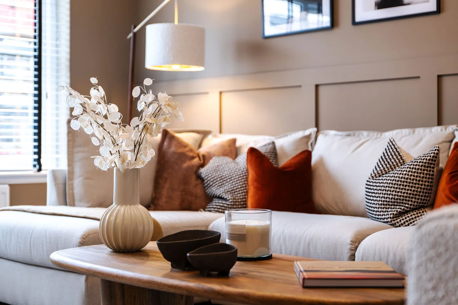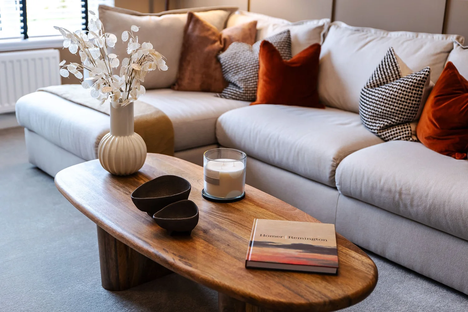 We opted to go bold with this design brief, choosing earthy, rich colour palettes of Acai, Leather and chocolate paint tones and colour drenching the bedrooms for a rich feel. We wanted to create a dimensional space in the lounge and the hallways, utilising wall panelling and a black painted staircase for extra detailing and impact. We placed a large chaise style sofa that utilises the lounge space, creating a comforting environment.