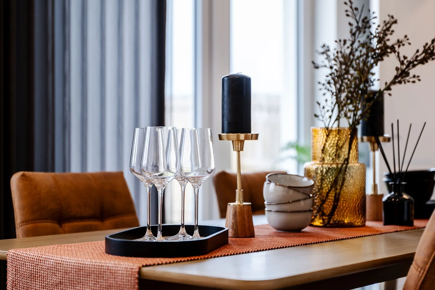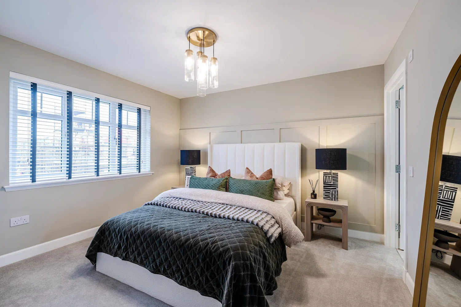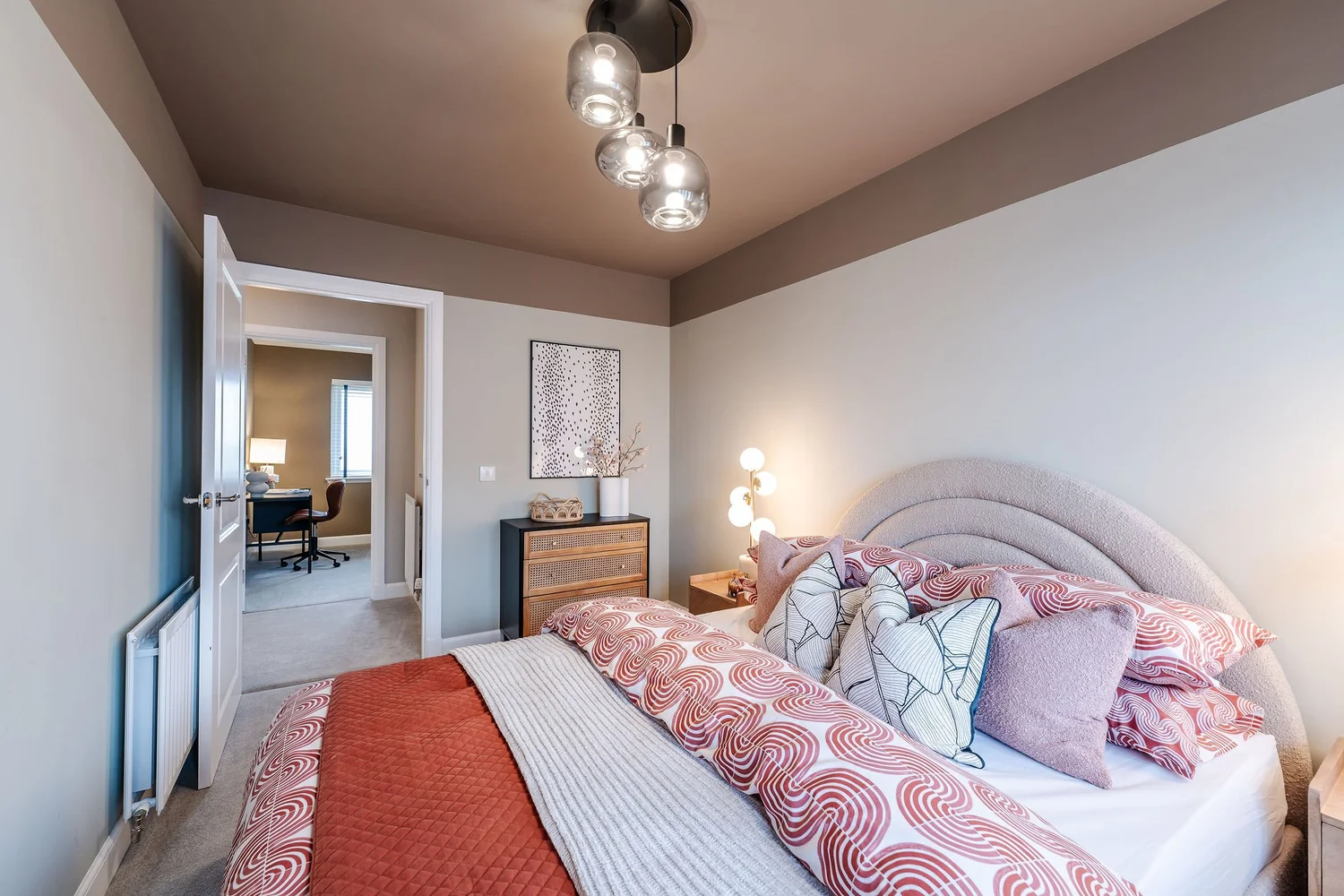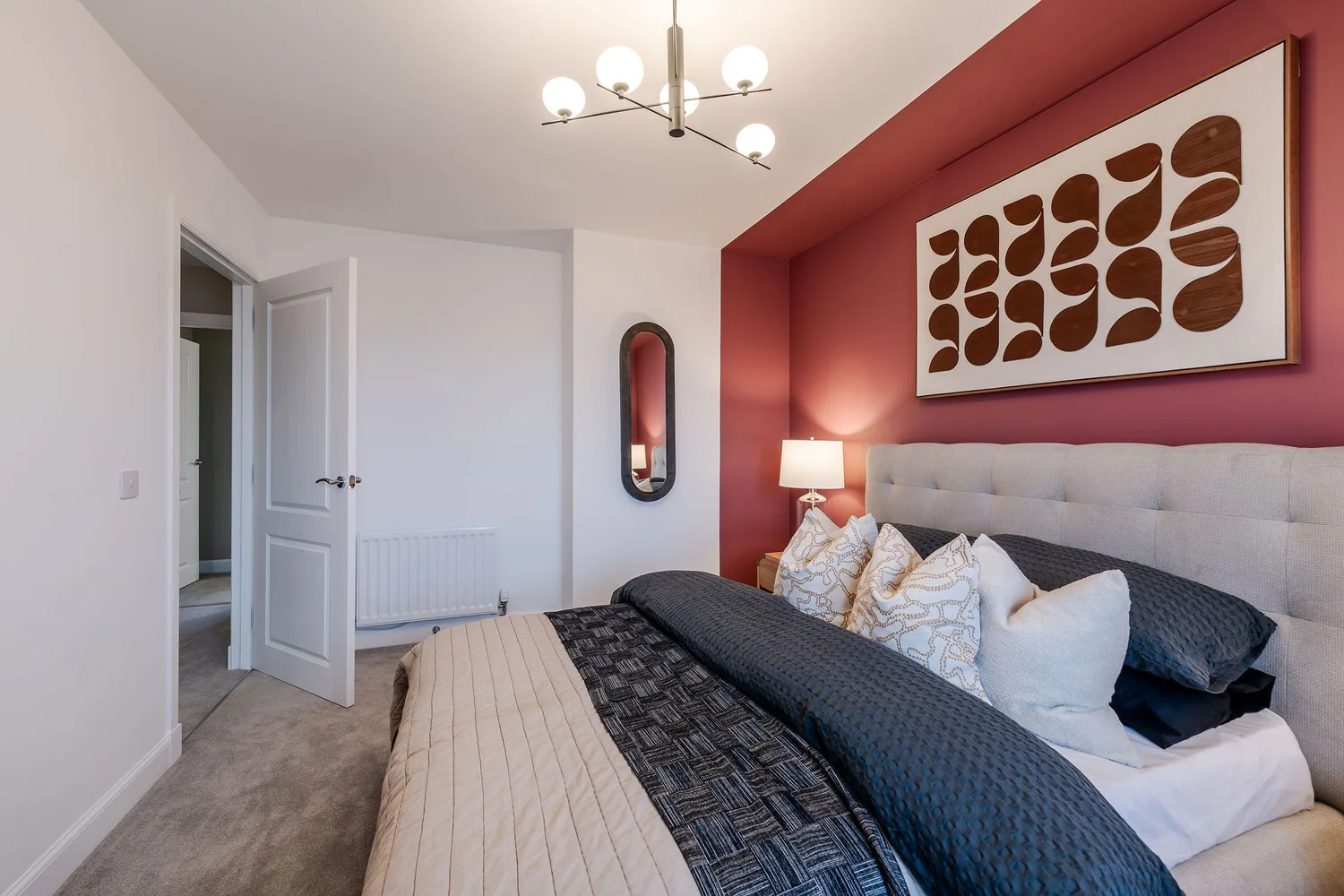 We opted to go bold with this design brief, choosing earthy, rich colour palettes of Acai, Leather and chocolate paint tones and colour drenching the bedrooms for a rich feel. We wanted to create a dimensional space in the lounge and the hallways, utilising wall panelling and a black painted staircase for extra detailing and impact. We placed a large chaise style sofa that utilises the lounge space, creating a comforting environment.